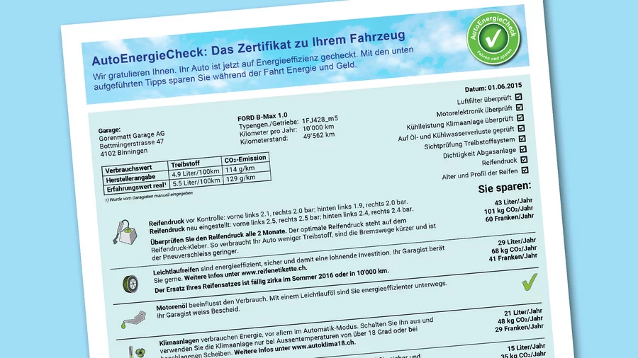 Il CheckEnergeticaAuto (CEA) è un servizio ecologico di AGVS che aiuta gli automobilisti a risparmiare energia e denaro. Il CEA consiste in alcuni interventi effettuati sul veicolo in officina e si conclude con una consulenza personale.